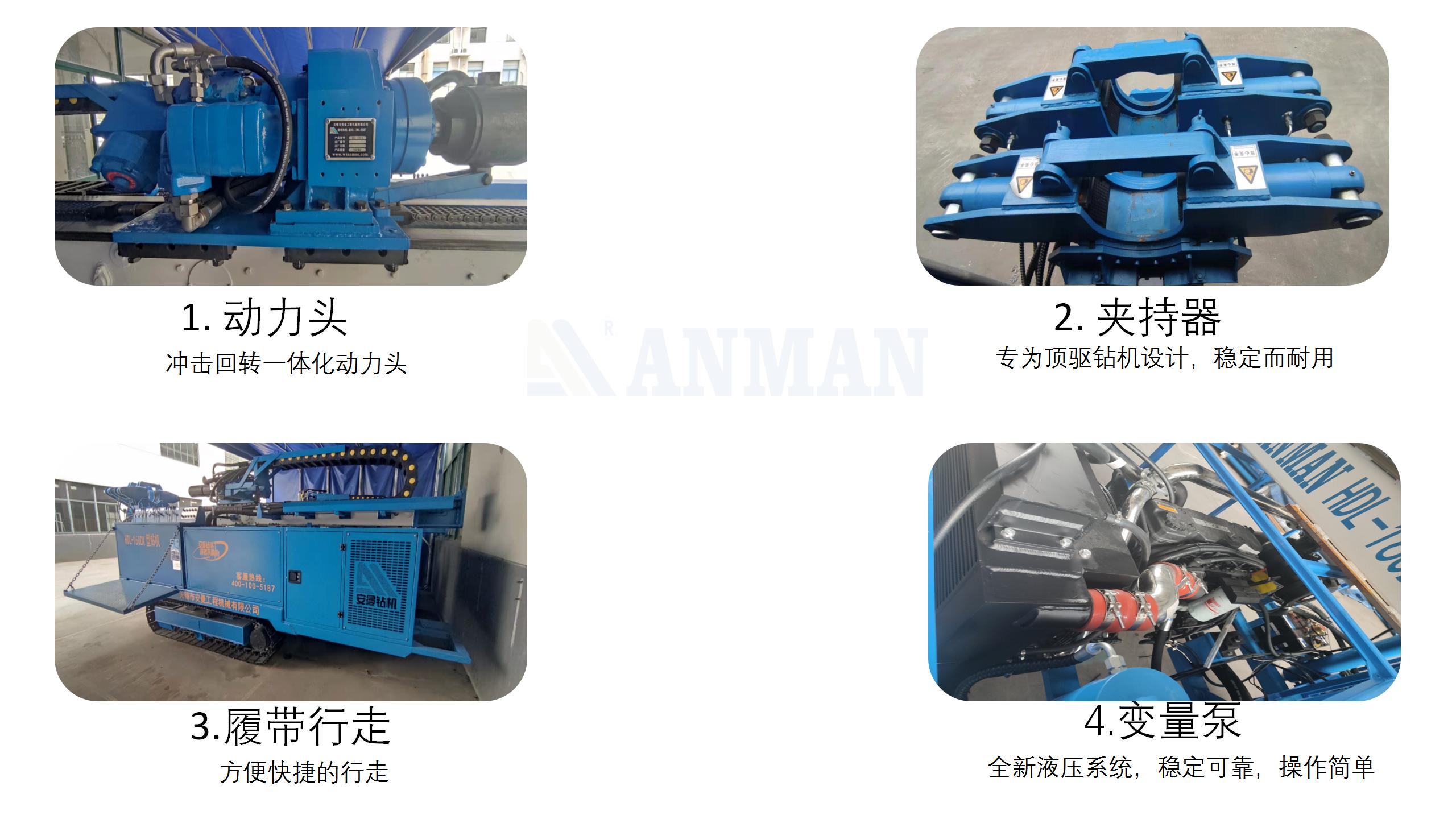 1、动力头带有高频率顶部冲击功能,可以不用气动冲击器即可实现冲击钻进。