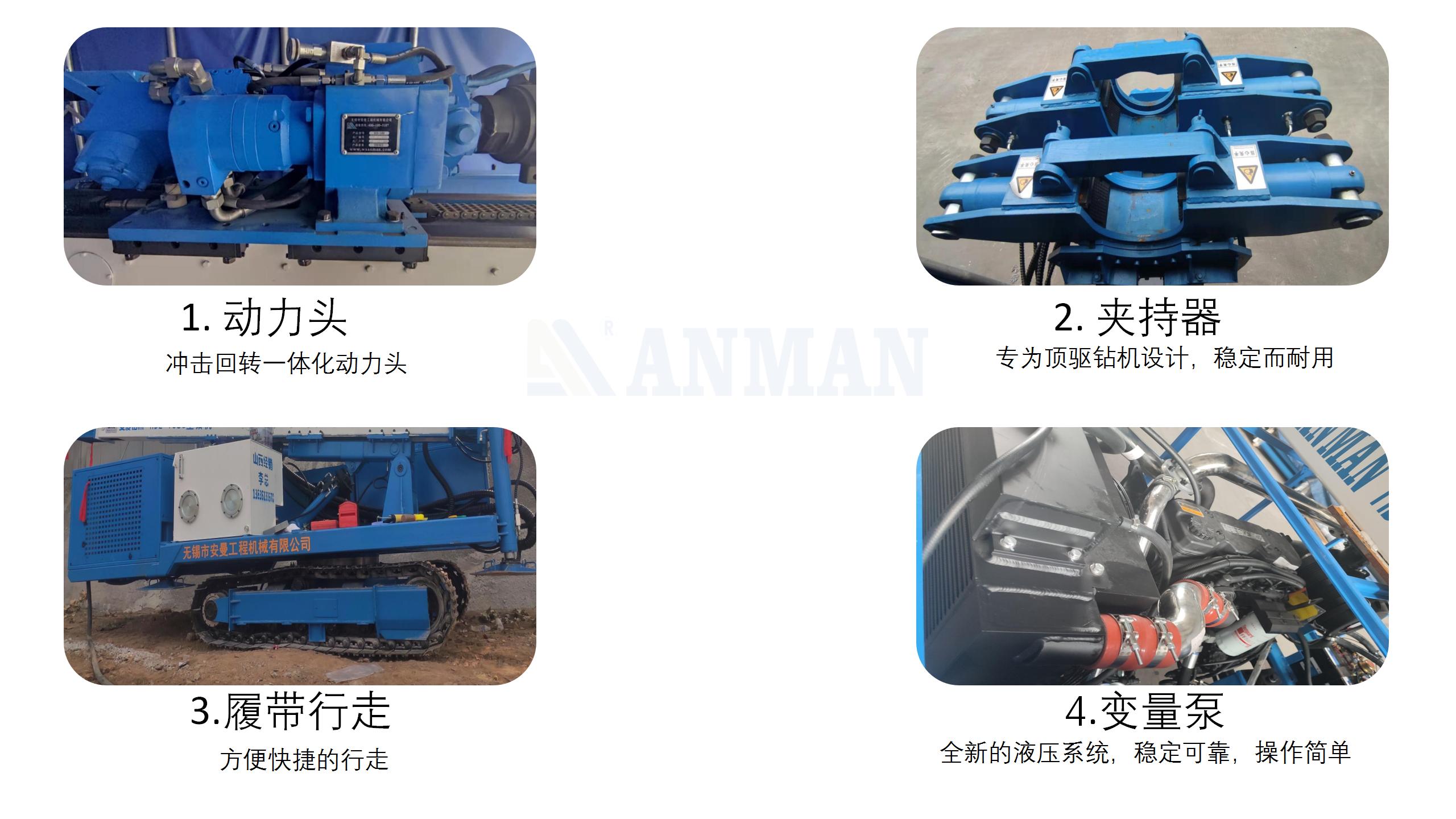 1、动力头带有高频率顶部冲击功能,可以不用气动冲击器即可实现冲击钻进。