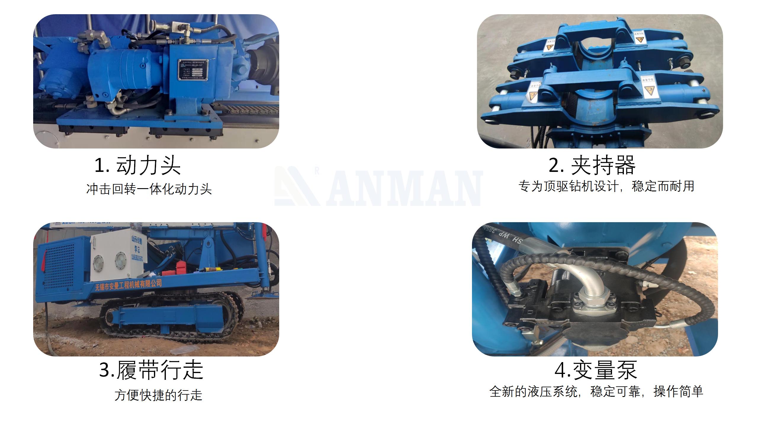 1、动力头带有高频率顶部冲击功能,可以不用气动冲击器即可实现冲击钻进。